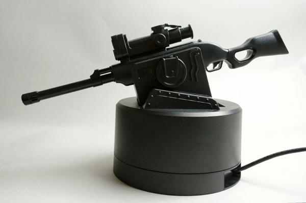 「Webカメラ照準器付きUSBスナイパー」は、ライフルっぽいデザインの銃に台座がセットになったビジュアルをしている。