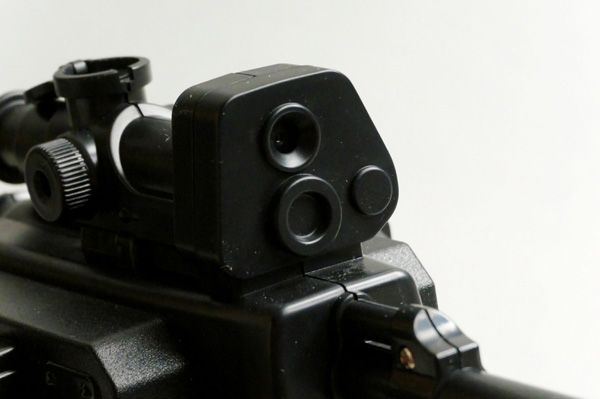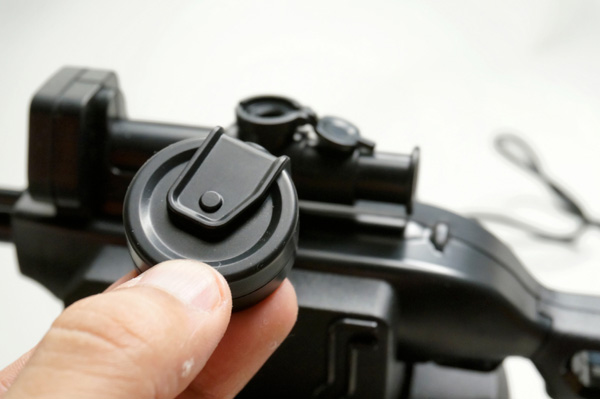 | Webカムはスコープにあたる場所にセットされている | BB弾はスコープユニット上部から入れる仕組み。11発まで装填可能(ちょっとキャップが浮くので、厳密には10発か) | 本体側面には予備弾倉もある。こちらは25発セットできる |
