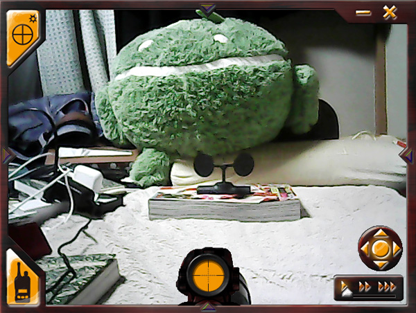 起動させると、Webカムの映像が表示され、操作用インターフェイスも画面端に表示される。主に使用するのは、画面右下にあるカーソル型アイコンと、画面下中央にあるスコープ型のアイコンだ。カーソル型アイコンは上下左右のアイコンをクリックすると、本体がその方向に動作する(カーソルキーとスペースキーでも操作可能)。その下にある再生ボタンのようなアイコンは、上下左右のアイコン1クリックあたりの本体のパン・チルト距離に影響するものだ。基本的な使い方は「最初は大きく動かし、厳密にエイムしたい(狙いたい)場合は最小動作にする」という感じになる。動作はスムーズなので、まずはその挙動を楽しんでみるといいだろう。