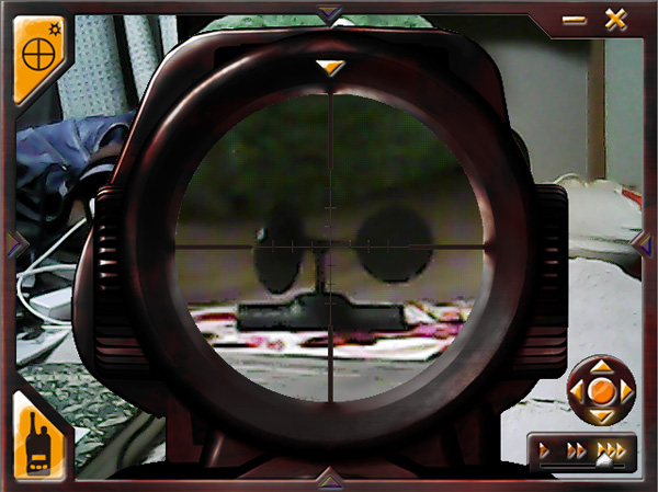 | 付属品としてターゲットもある。まずはこれを狙ってみよう | 専用アプリケーションのインターフェイスはスッキリしている。右下のカーソルアイコンで操作して射出だ | スコープを覗いたところ。デジタルズームで荒くなるのだが、ターゲットする分にはあまり問題はなかった |