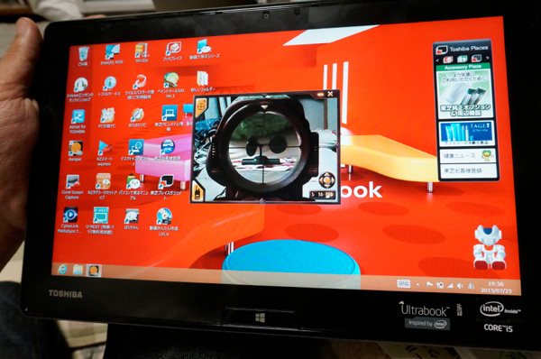 | 調整前はこの状態で射出すると、ちょうど左の的に当たる状態だった | 使用したデバイスは、dynabook V713。ウィンドウサイズの変更ができないため、タッチよりはマウス操作が正解だ |