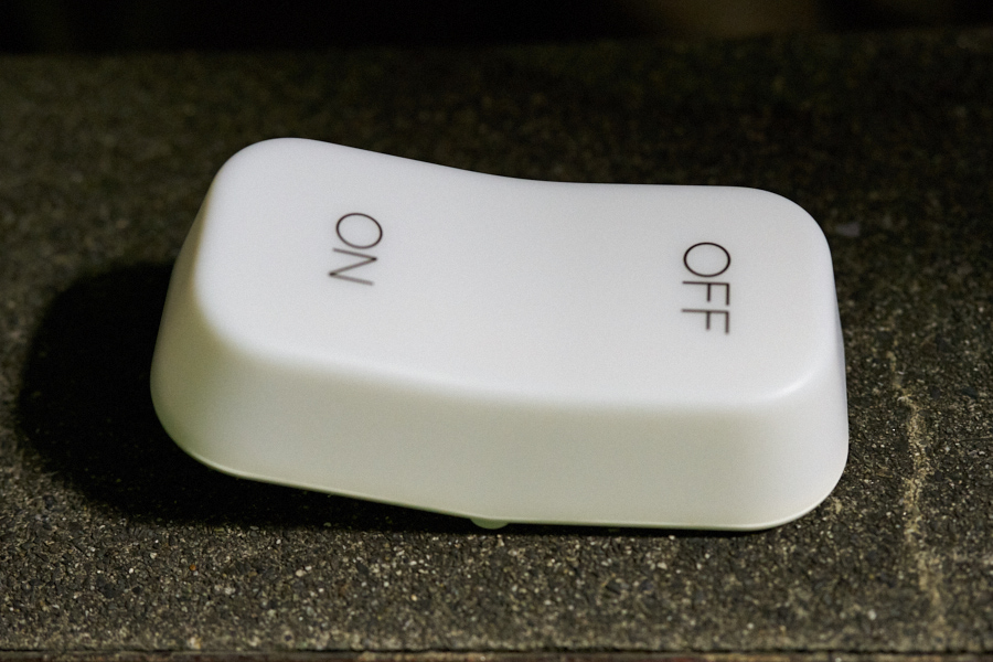 ON/OFFスイッチ型LEDライトは見た目の通り、スイッチ形状のLEDライトだ。天板部にあるON/OFFのプリントからもわかるように、押すと点灯・消灯といった仕様になる。なお、白昼色モデルと電球色モデルのふたつがあり、今回は白昼色モデルを試している。