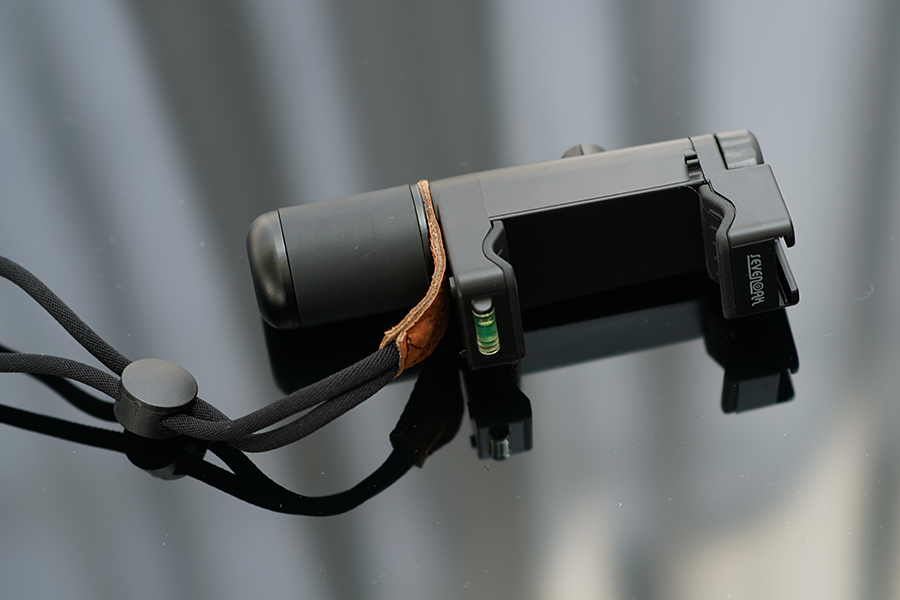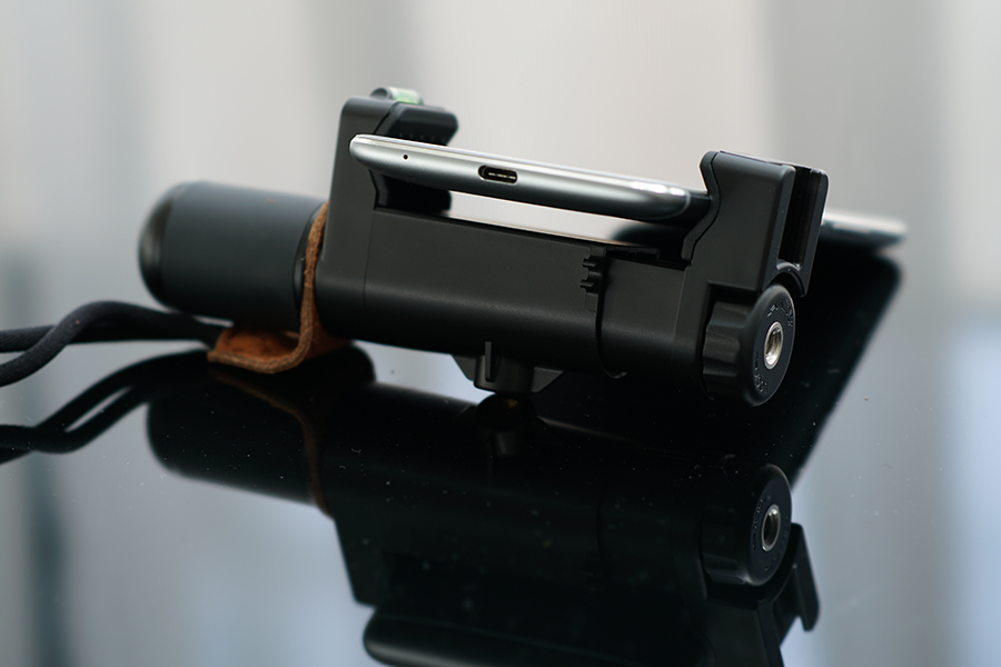 | 比較的コンパクトなハンドグリップ。水準器も搭載している | 窪みがあるため、端末側面の形状に左右されにくい |