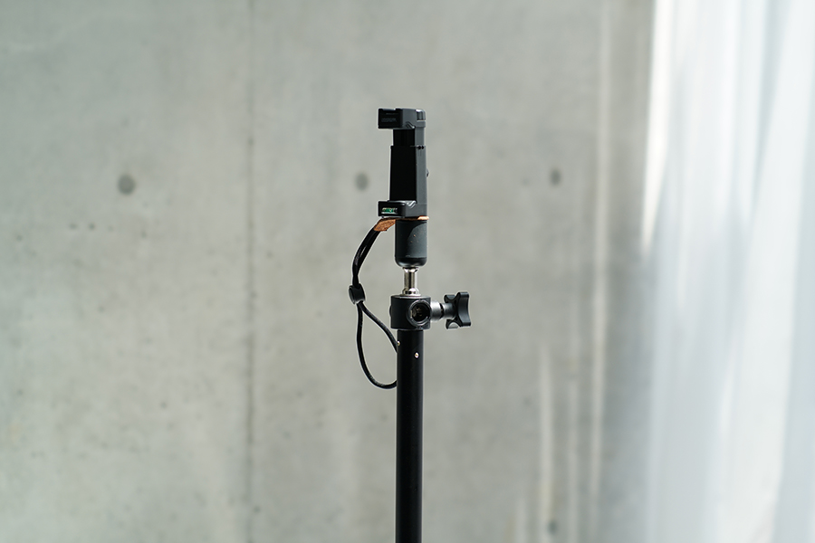 | 脱着可能なパーツを外した状態 | ライトスタンドにセットしたところ。ホルダーにいろいろ挟んだり、引っかけたりできそうだ。アクションカムの固定もOKである |