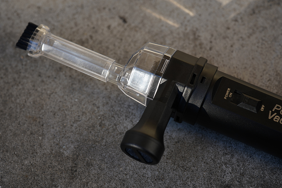 まずはバキュームモードから見ていこう。コンパクトな掃除機そのもので、先端からゴミを吸い込んでいく。ただ、強烈に吸い込む性能はないため、細かいホコリを吸い込める程度の性能である。先端が細めであるため、ディスプレイのベゼルとパネルの隙間や、PCケース天板のホコリを掃除するのは得意だ。ともあれ、それほどパワーはないので、そこを意識しておく必要がある。