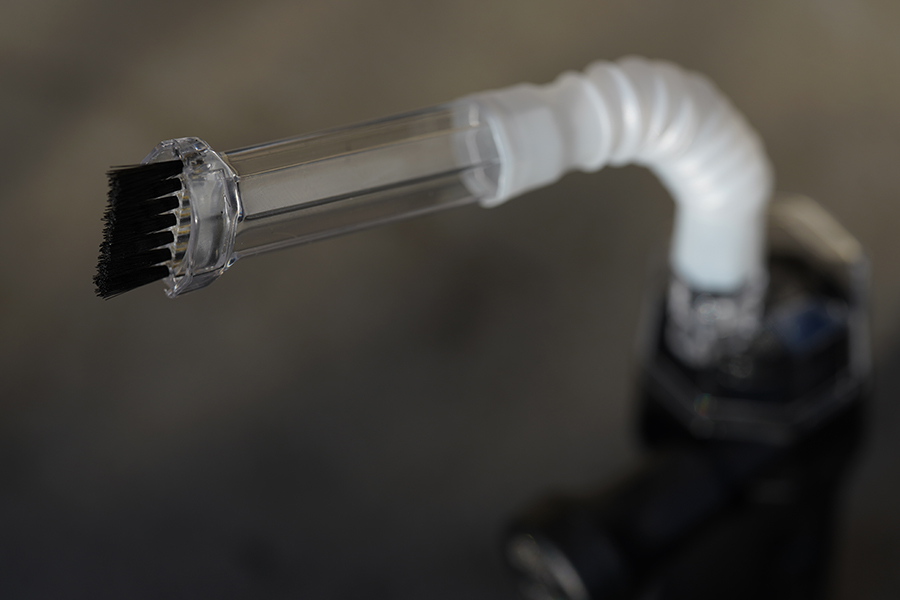 また、バキューム用アタッチメントにはブラシを装着することもできる。ブラシでホコリを浮かせて、それを吸い込む形だが、こちらは効果的だった。ゲームパッドやマウスなどの隙間に強く、もっとも出番が多そうである。フレキシブルノズルとの合体も可能だったので、手の届きにくい場所用としても活用できるだろう。