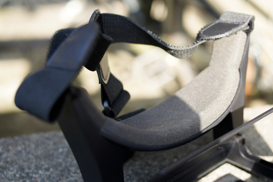 頭部への装着はバンドを使用し、このあたりはVRゴーグルと同じだ。フィッティングも伸縮性の高いバンドを利用するため、大半の頭部にマッチするほか、額が接触する部分のスポンジは厚くなっているため、装着時のフィーリングも良好だ。