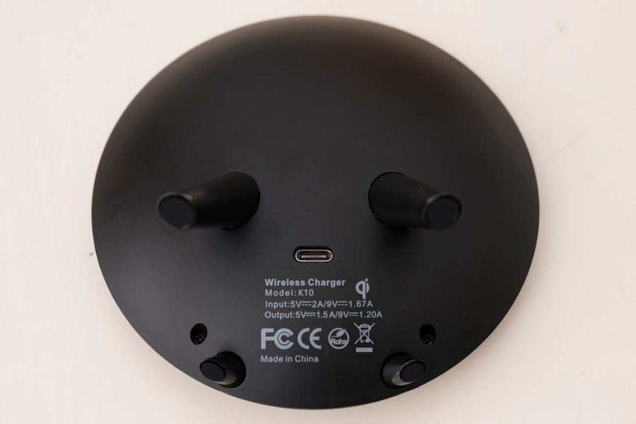 今回紹介する「Qi対応 ワイヤレス急速充電器」を見ていくと、サイズは高さ100×幅115×奥行70mm、やや後ろに傾斜したデザインになっており、背面には脚×2もある。対応機器を設置する部分は直径115mm。