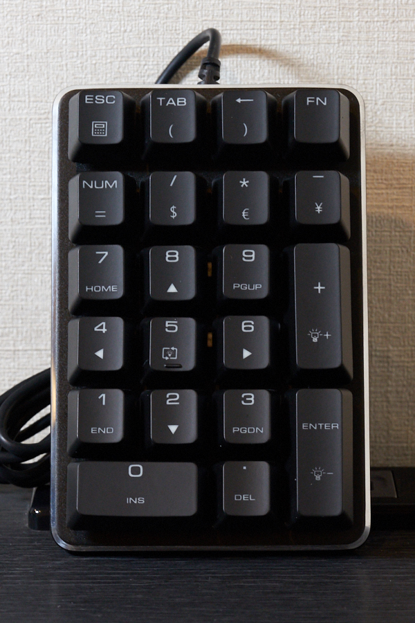 3つの製品は先に触れた通り、見た目に違いはあるものの、仕様は共通している。US配列のテンキーとなっており、0~9キーのほか、ピリオドキーやEnterキー、TABキー、+キー、-キーなどのほか、ESCキーもある。また、FNキーとの組み合わせにより、Excelで使用率の高い記号や矢印キー、Pageupキーなどもありと、だいたいのことを片手で済ませられる配列だ。
