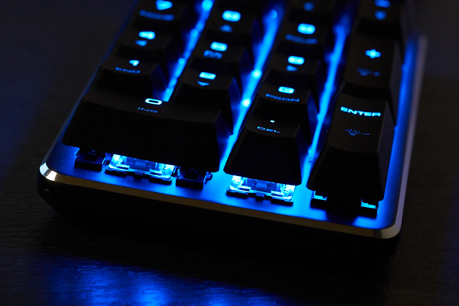 ライトアップ機能は青色LEDのみとなっており、全灯のほか、入力したキーの点灯などがある。少し残念であるのは、Numberlockオン時に点灯状態をオフにできないことだろうか。