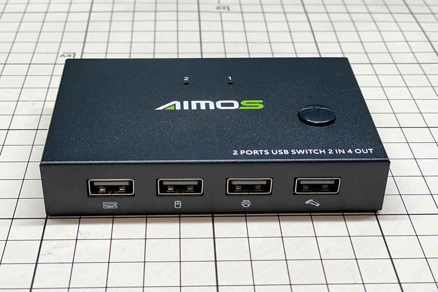 切り替えは天板にあるボタンを押すと、1と2が交互に切り替わる。選択中の接続先は番号直下にランプがあり、その点灯で分かる。輝度が高くはなく、平置きした際はどちらか分かりにくいため、天板が見えるようにどこかに貼り付けるか、反射体を設置して確認しやすくするといいだろう。