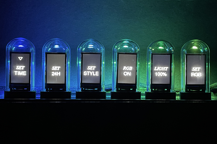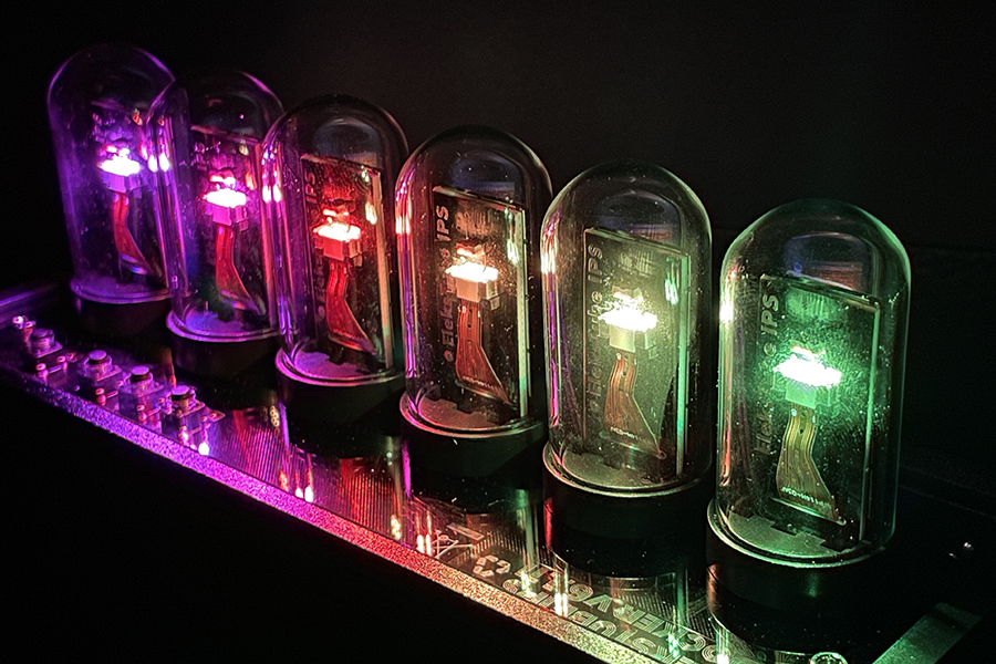 液晶パネルとガラスチューブで擬似的にニキシー管風の見た目を実現した置き時計