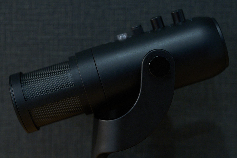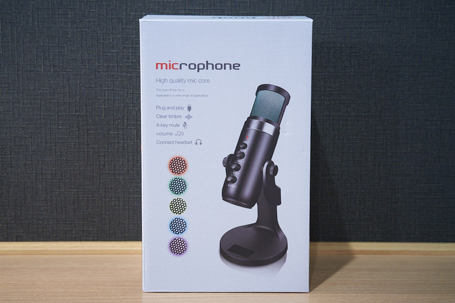 本製品はスタンドとセットの状態でパッケージに入っており、サイズは高さ約245×直径約100mmになる。マイク本体は直径約50mm。下記写真のように操作ダイヤルやボタン以外のスペースに余裕があるため、ポップガードやウィンドジャマーの取り付けもやりやすい。また本体上部、マイクのある部分にはLEDが内蔵されており、グリーン、ネイビー、ブルー、イエロー、バイオレットの5色か、自動で色が変わるのを楽しむことができる。