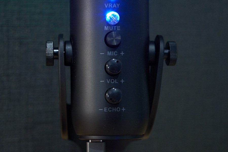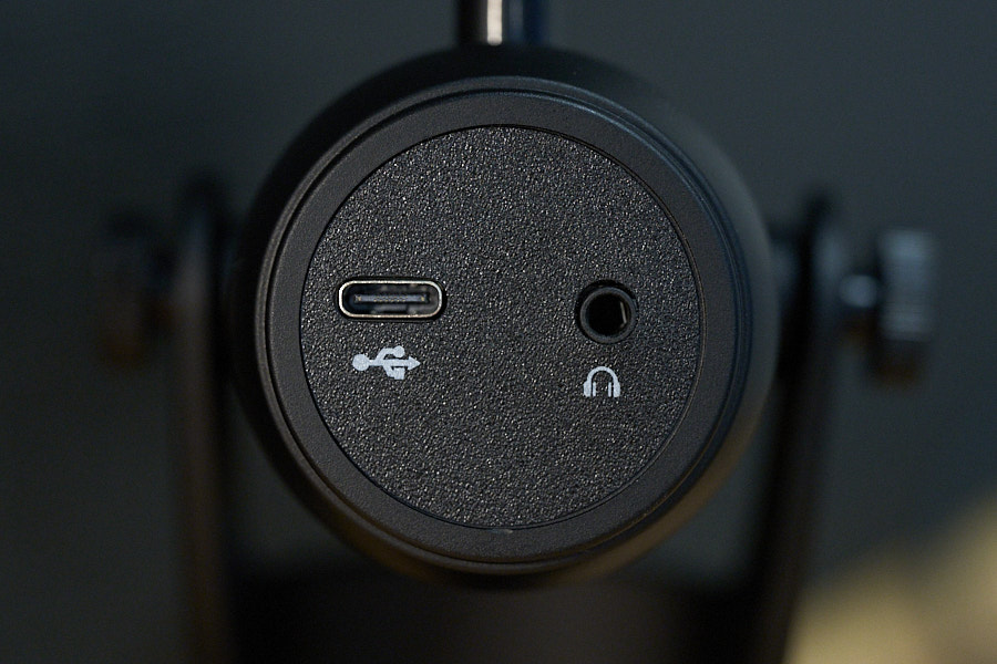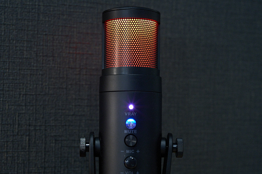 操作ダイヤルとボタンを見ていくと、まず頂部にタッチセンサー式のミュートボタンがある。正面には上からLEDカラーを変更するVRAYボタン、マイクボリュームダイヤル(押下でミュート)、モニタリング用ボリュームダイヤル、エコーダイヤルが並ぶ。エコーダイヤルは文字通り、エコーの調整ができる。また底部にはPCやスマートフォンとの接続用にUSB Type-Cポート、ヘッドフォンジャックがあり、USBマイクとしては多機能だ。
