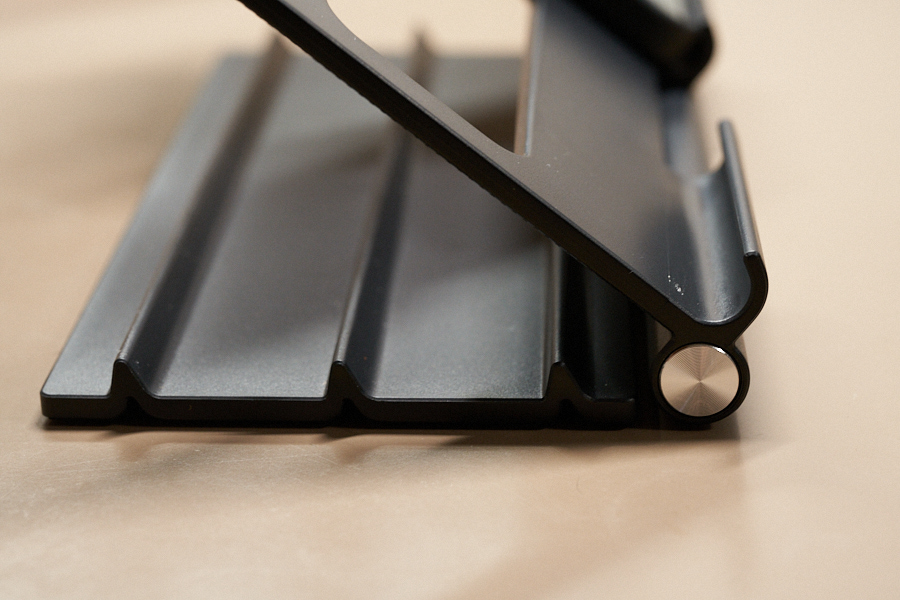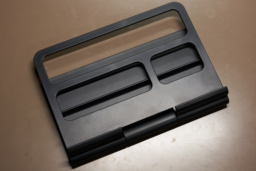 本製品はシンプルなビジュアルとなっている。サイズは折りたたんた状態で205mm×150mm×32mm。スタンドでいう背もたれの部分にはタブレットやリモコン、電卓を差し込んでおける孔があるほか、本体下部にはスタンドとしても機能するようにツメも用意されている。