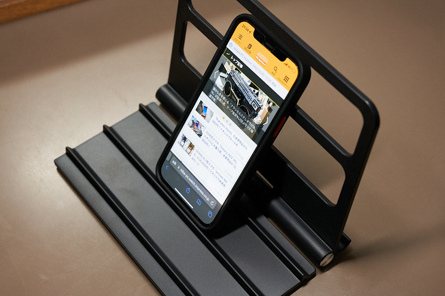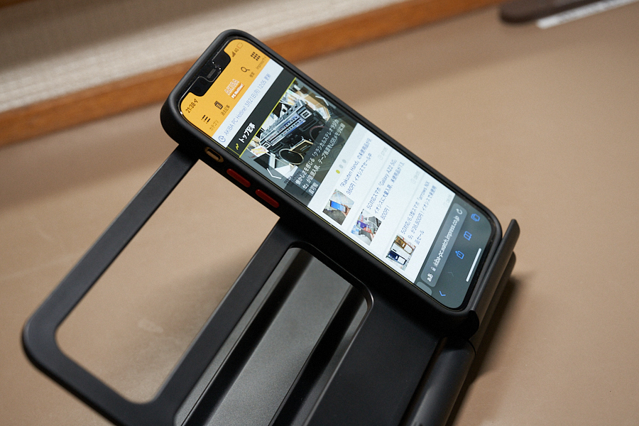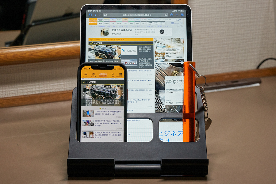 スタンドとして見てみると、スマホは2台まで、もしくは、スマホとiPad Pro(11インチ)もOKだったほか、本や書類もOKであり、意外にも自由度は高い。なお、ストッパーがない関係で縦に長く、重量のあるデバイスは苦手だ。iPad Pro(12.9インチ)は縦位置だと背もたれが重量に負けてしまったが、横位置であれば問題なく、スタンドとして機能していた。