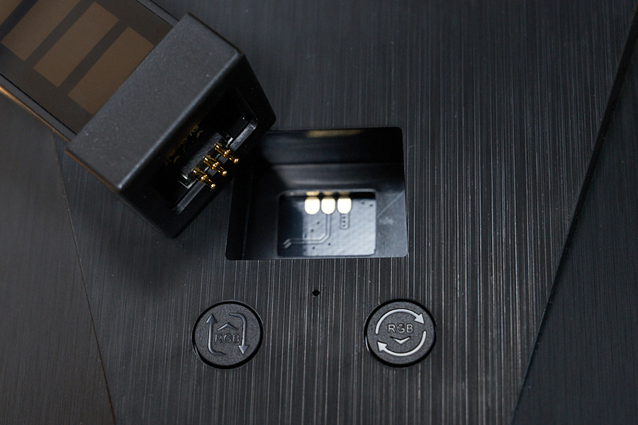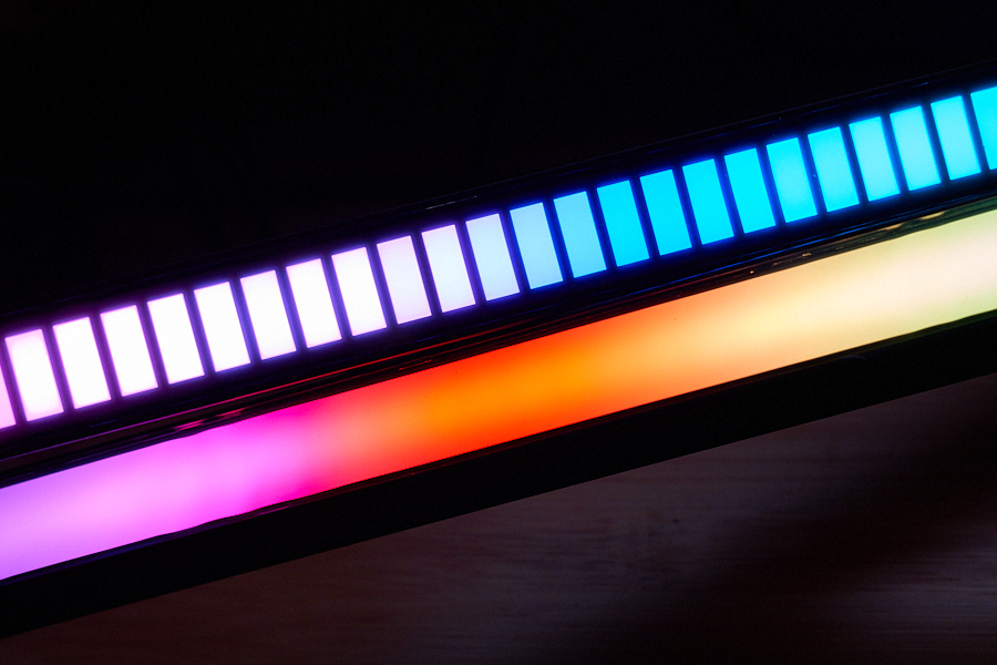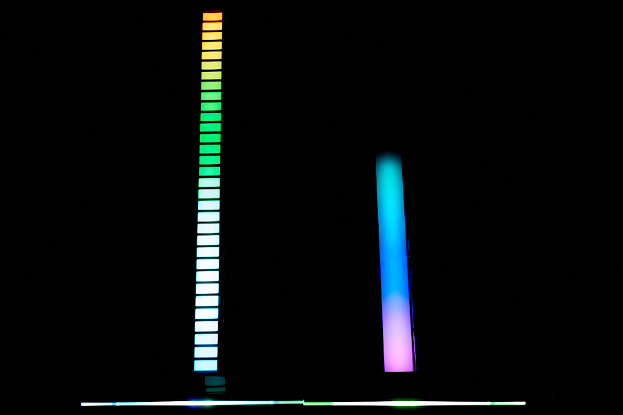まずライトアップ周りから見ていこう。レベルメーターは台座にある左スイッチを押すごとに点灯モードが変更する。全10種類あり、同ボタン長押しで消灯も可能だ。また台座の右スイッチを押すと台座底部のライティングを全16種類から選べ、これも同ボタン長押しで消灯できる。