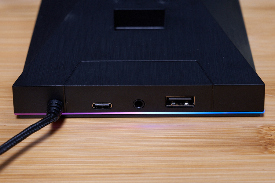 台座の裏側を見てみよう。ケーブル長約1.6mのUSB Type-AはPCもしくはUSBアダプターに接続するためのものだ。それ以外にはUSB Type-A×1、USB Type-C×1、3.5mmヘッドフォン端子がある。USB Type-AとUSB Type-CはハブでともにUSB 2.0。3.5mmヘッドフォン端子は本製品が内蔵するUSB音源につながる。