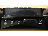 | 本体の操作は、ほぼ機能ごとに分けられている。左のターンテーブルがリズム機能、中央がミキサー機能、右のターンテーブルがスクラッチ機能だ | 主な入出力端子は背面にレイアウトされる。プレーヤーを接続するためのAUX端子2基と、出力(ラインアウト)端子だ。形状はすべてステレオミニタイプ。このほか前面にマイク端子とヘッドホン出力端子がある |