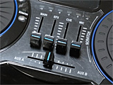 中央にはオーディオミキサー機能を担当する、スライド型のボリュームコントローラーがまとめられている。機能は左からマスター(ライン出力全体の音量)、リズムやスクラッチの効果音、ヘッドホン出力、マイクの音量になっている。下は2台のプレーヤー間の音量を調整するクロスフェーダーだ。