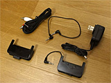 | 付属品は、iPhone用ホルダー(ヘッドホン端子の向きで2種類ある)や接続ケーブル2種類、ACアダプタと一通りが揃っている。プレーヤーとヘッドホンやアンプ内蔵スピーカーがあれば、購入後すぐに遊べる | iPhone用ホルダーを本体に装着した状態。こう設置すると、ターンテーブルなどを操作しながらでも、iPhone側での選曲が楽にできる |