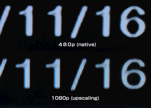 写真はプレイステーション2のメニュー画面の一部を480pモードと1080pモードで撮影したものだが、1080pは数字の「6」や漢字の輪郭がシャープになっており、キチンとしたアップスケーリング効果を持つことがわかるだろう。