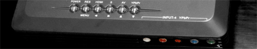 | 背面の横幅いっぱいに設けられた入力端子。コンポジットビデオとSビデオ、HDMI入力と出力が配置されている | コンポーネントビデオ(YPbPr)入力は正面に配置されている。変換ケーブルを仲介すれば、D端子を使う機器との接続も可能だ | 本体の操作ボタンは天面手前に配置。画質設定などのメニューを呼び出すには、RES/MENUボタンの長押しが必要だ |