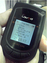 本体液晶パネルでの緯度・経度表示状態。英語表示だが、経度・緯度を知っていれば問題はないだろう。最下段にはGPSから受信した時刻も表示される |