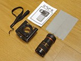 「DN-MPLENZ」の内容物一式。実際に使用するには、右手前にあるレンズと、その左にある携帯電話へのクリップ「ユニバーサルホルダー」の2つが必要になる |