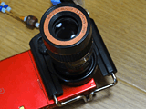 レンズはマニュアルフォーカス式。キヤノンの高級レンズを意識した(?)赤リングの意匠が面白い |