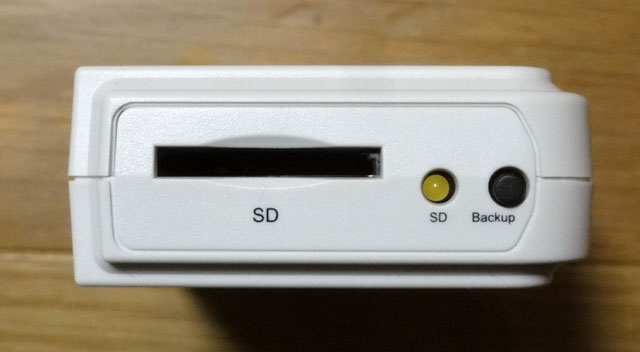 | 本体は手の中にらくらく収まるほど小さい。SDカードスロットの大きさからもその小ささがわかるだろう | SDカードスロットは標準サイズ専用だ。右端のバックアップボタンは、2秒間長押しすることでUSB接続のドライブにSDカードのデータをバックアップできる | 背面には電源とUSB、LAN端子が搭載されている。LAN端子はギガビット(1000BASE-T)に対応するので、なるべく高速な端子に接続したい |