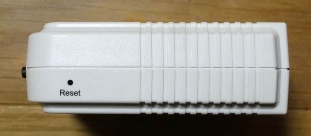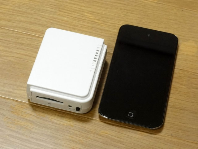 | 右側面にはリセットボタンが配置されている。長押しすることで設定を出荷状態にリセットする機能もある | iPod Touchと並べたところ。幅はほぼ同じ程度だ | 付属品はユーティリティCD(PDFマニュアルも収録)、インストール用簡易マニュアル、ACアダプタ。LANケーブルは付属していない |