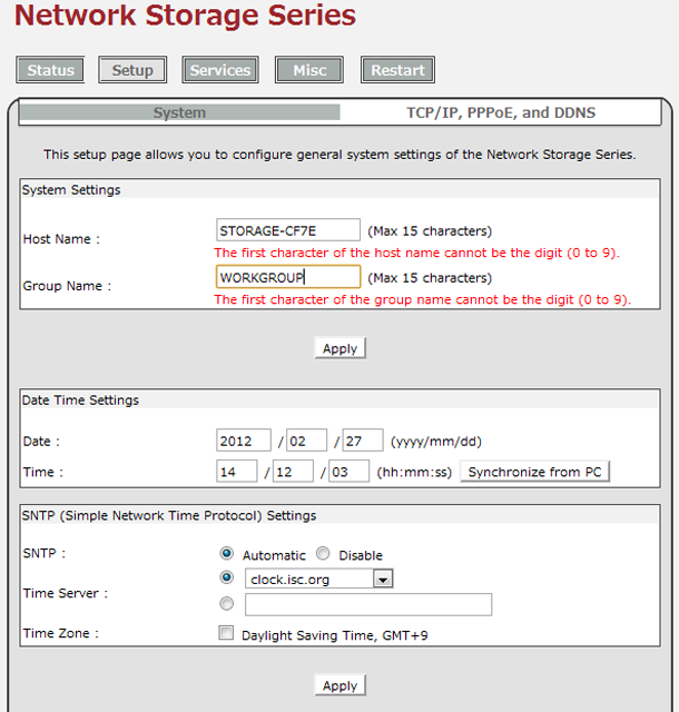 設定画面で最初にすべきは「Setup」→「System」メニューで、本機のホスト名とグループ名を変更すること。とくにグループ名は、Windowsの「ワークグループ」と合わせておくと、認識のトラブルが減少するので、Windows側を調査して本機を合わせるのがオススメだ。