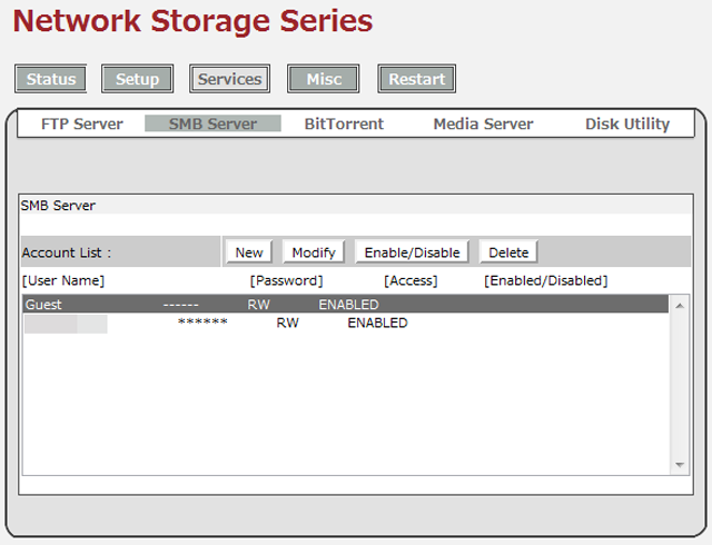 ドライブが認識されれば、「Services」→「SMB Server」メニューのリストに「Guest」が表示されているはずだ。ここでリストの上の「New」ボタンをクリックすると、本機のドライブにアクセスする際のユーザー名とパスワードが設定できる。