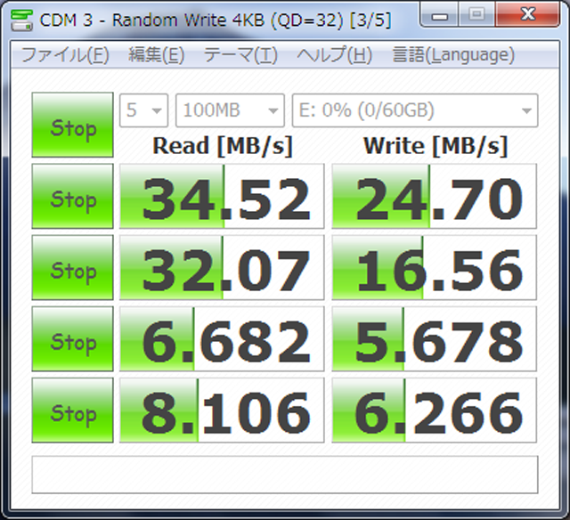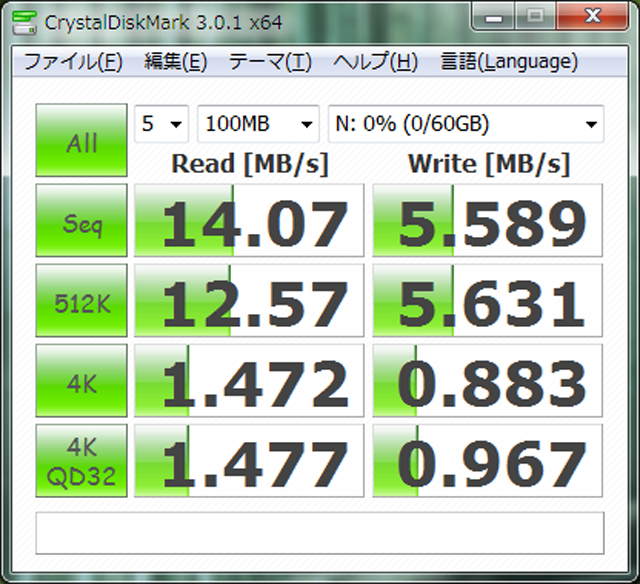 | USB変換したSSDを本機を通して接続した状態(左)と、パソコンに直接接続した状態(右)で、CrystalDiskMarkを使い速度を比較。本機を通した状態ではリードが14MB/秒、ライトが5.5MB/秒と、ほぼカタログ値通りの速度だ | |