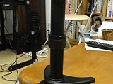 | 支柱部の固定はガッチリとできるので、このように机の端側に重量を掛ける状態でもしっかりと安定する。また関節を動かすのも力を入れずにできるので、楽だ。関節部の強さは上腕部中央のガス圧調整ネジで、ディスプレイやトレイを外さずに設定できる | |