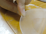 シート自体の粘着力もかなりのものなので、剥がす時には強く引っ張る必要がある。指付近のシートの伸び具合から、かなり強く貼り付いているのが想像できるだろう |