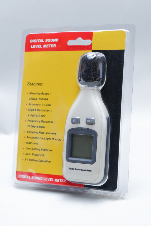DNSB-69428はいわゆる「騒音計」で、機能としてはデシベル(dB)値を計測してくれるもの。サイズはH149×W57×D26mm、重量は145g(9V乾電池込み時)とサイズも小さく、測定値もある程度の制度で確認できる。