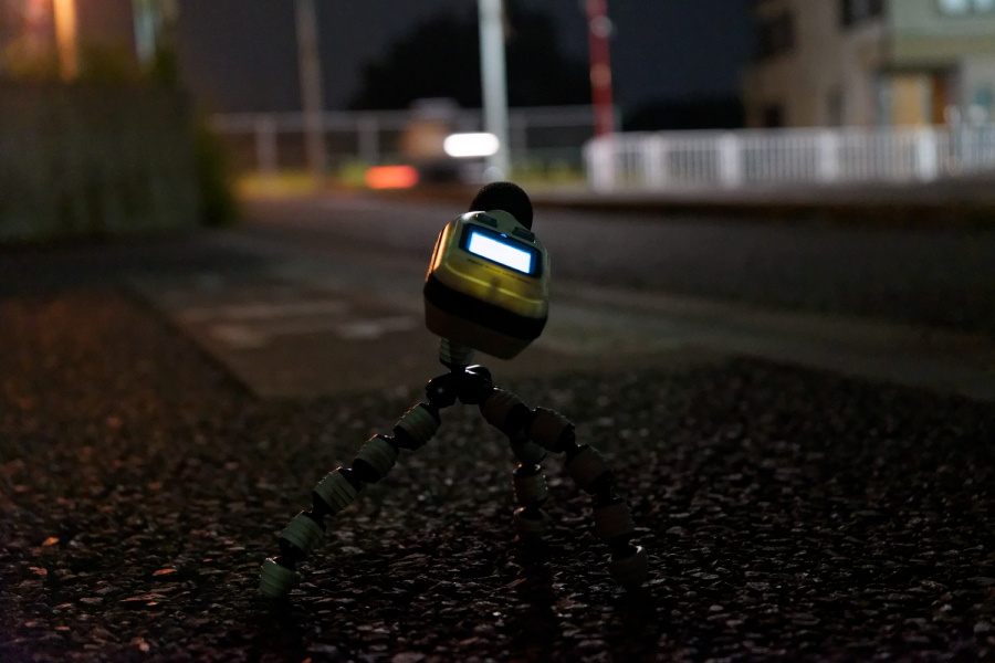 | 深夜の道路で計測しているところ。使用している三脚はDN-TR21174 | 計測結果は43.5dB。交通量の少ない場所なので静かなものである |