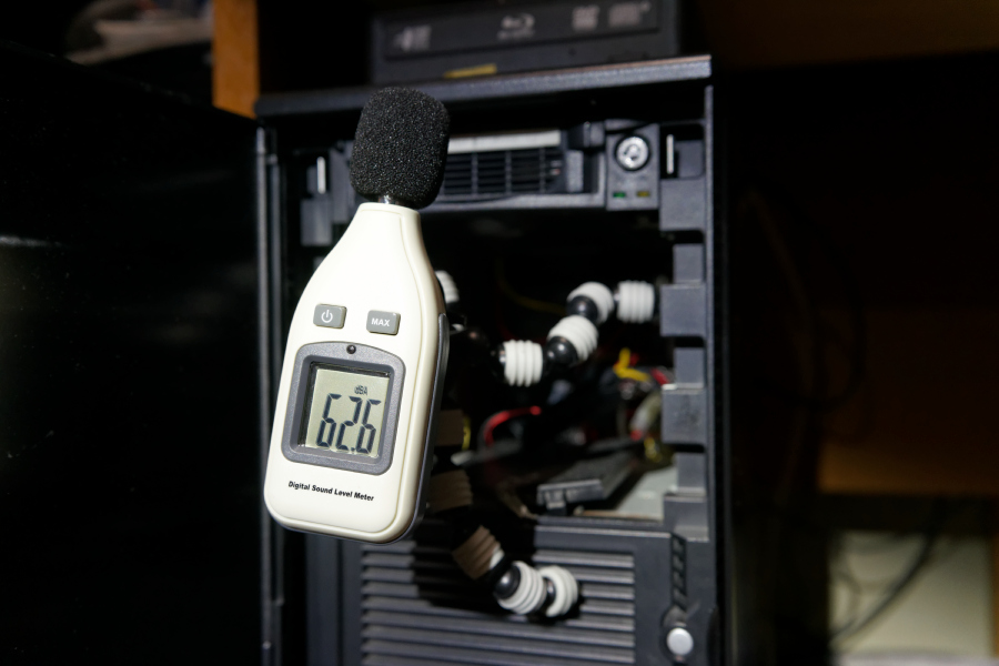 | CPUファンの回転数を最大にして、ケース付近から計測したところ、62.6dBという高値になった。離れていてもけっこううるさく感じたのにも納得がいく |