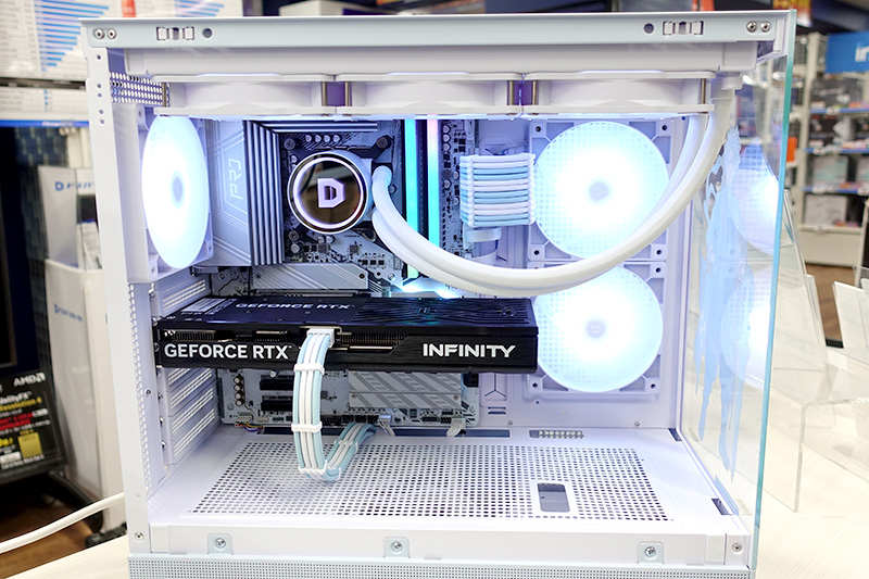 SSDはPCIe 4.0接続のADATA製500GB SSD、玄人志向製650W電源搭載で、メモリ/CPUクーラーはドスパラセレクトだ。ドスパラ秋葉原本店 登坂氏によると、この価格であっても、FPSゲームやRPGなどが問題なく動くスペックを確保した構成になっているとのこと。CPUクーラーも360mm簡易水冷となっているのもポイントだ。