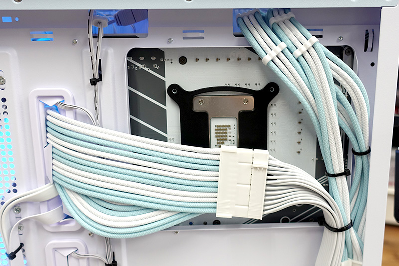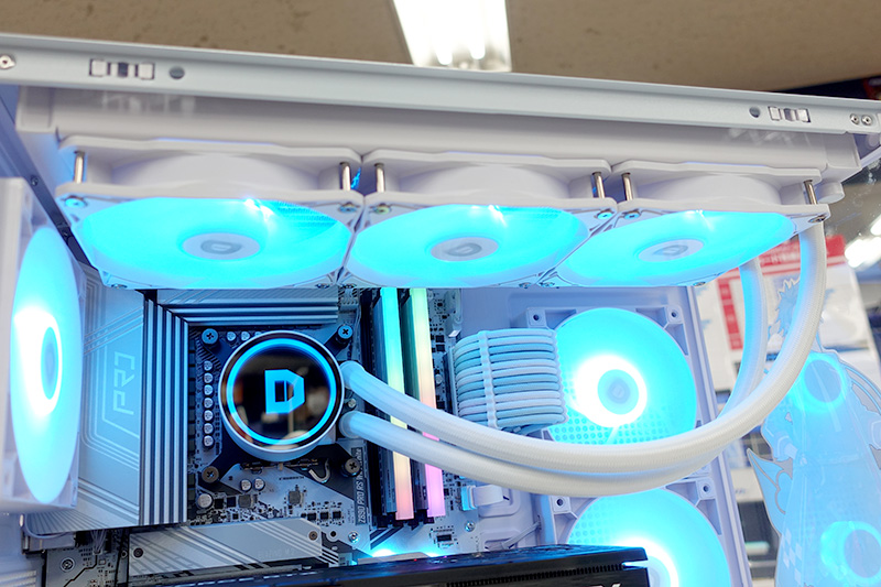 今回のコラボモデルでは、ピラーレスガラスパネル設計でケース内部をしっかり見ることができる、ドスパラセレクトの「XRパステルブルー」をPCケースに採用している。またCPUクーラーには360mm簡易水冷を採用し、電源延長スリーブケーブルを装着するなど、ケース内部の見た目にもこだわった構成だ。