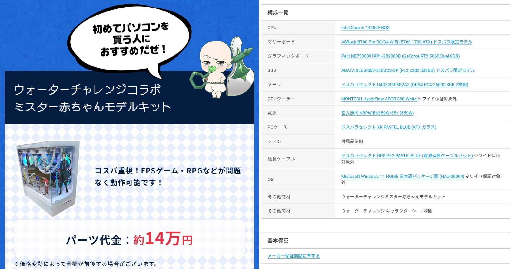 最もお求めやすい価格設定の「ミスター赤ちゃんモデル」では、CPUに「Core i5-14400F」、ビデオカードにPalit「GeForce RTX 5060 Dual 8GB」、マザーボードにASRock「B760 Pro RS/D4 WiFi」を採用。16GBメモリ搭載で、8⽉12⽇(火)時点の価格は、キット のみであれば約13.6万円。期間限定のキャンペーンを利用すれば、組立代行工賃も含めても約 14.8万円。