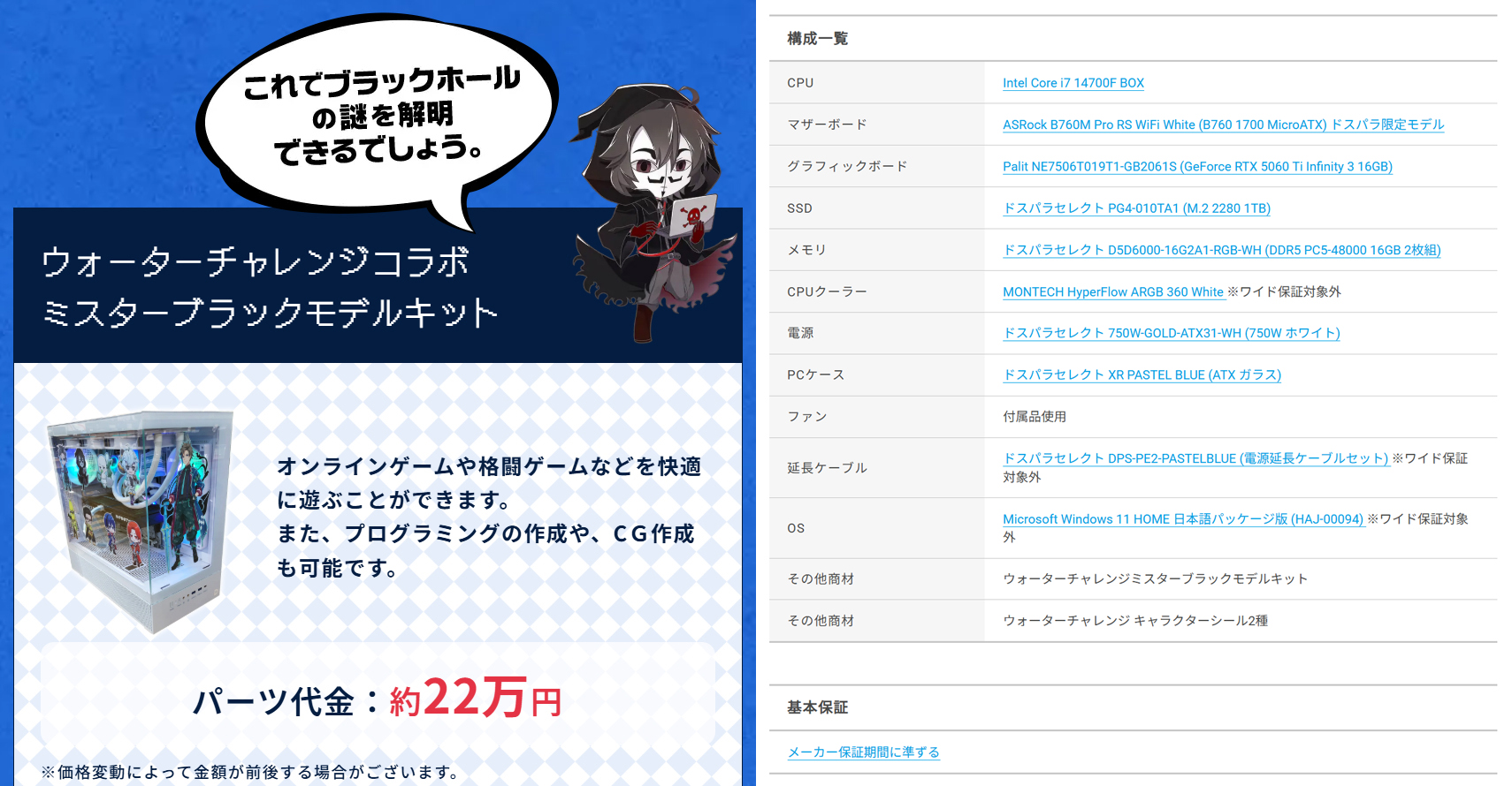 「ミスター⾚ちゃんモデル」の1つ上位モデルにあたる「ミスターブラックモデル」では、CPUに「Core i7-14700F」、ビデオカードにPalit「GeForce RTX 5060 Ti Infinity 3 16GB」、マザーボードにASRock「B760M Pro RS WiFi White」を搭載。メモリ/SSD/電源はドスパラセレクトで統一されている。12日時点の価格で、キットだけであれば約21.6万円。期間 限定のキャンペーンを利用すれば、組立代行工賃も含めても約22.8万円。