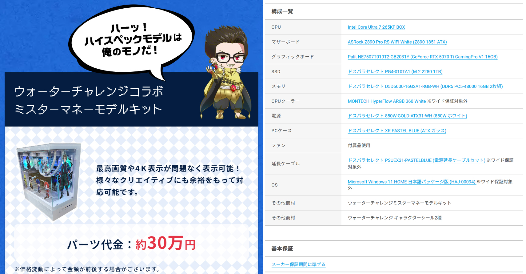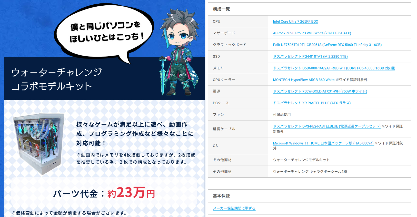 標準構成となる「ウォーターチャレンジコラボモデル」は、実際に同氏が組み立てたPCのパーツ構成をほぼ踏襲したモデルで、12日時点の価格はキットのみで約23.2万円。期間限定のキャ ンペーンを利用すれば、組立代行工賃も含めても約24.4万円。CPUにはIntel「Core Ultra 7 265KF」、ビデオカードにPalit「GeForce RTX 5060 Ti Infinity 3 16GB」、マザーボードにASRock「Z890 Pro RS WiFi White」を搭載。