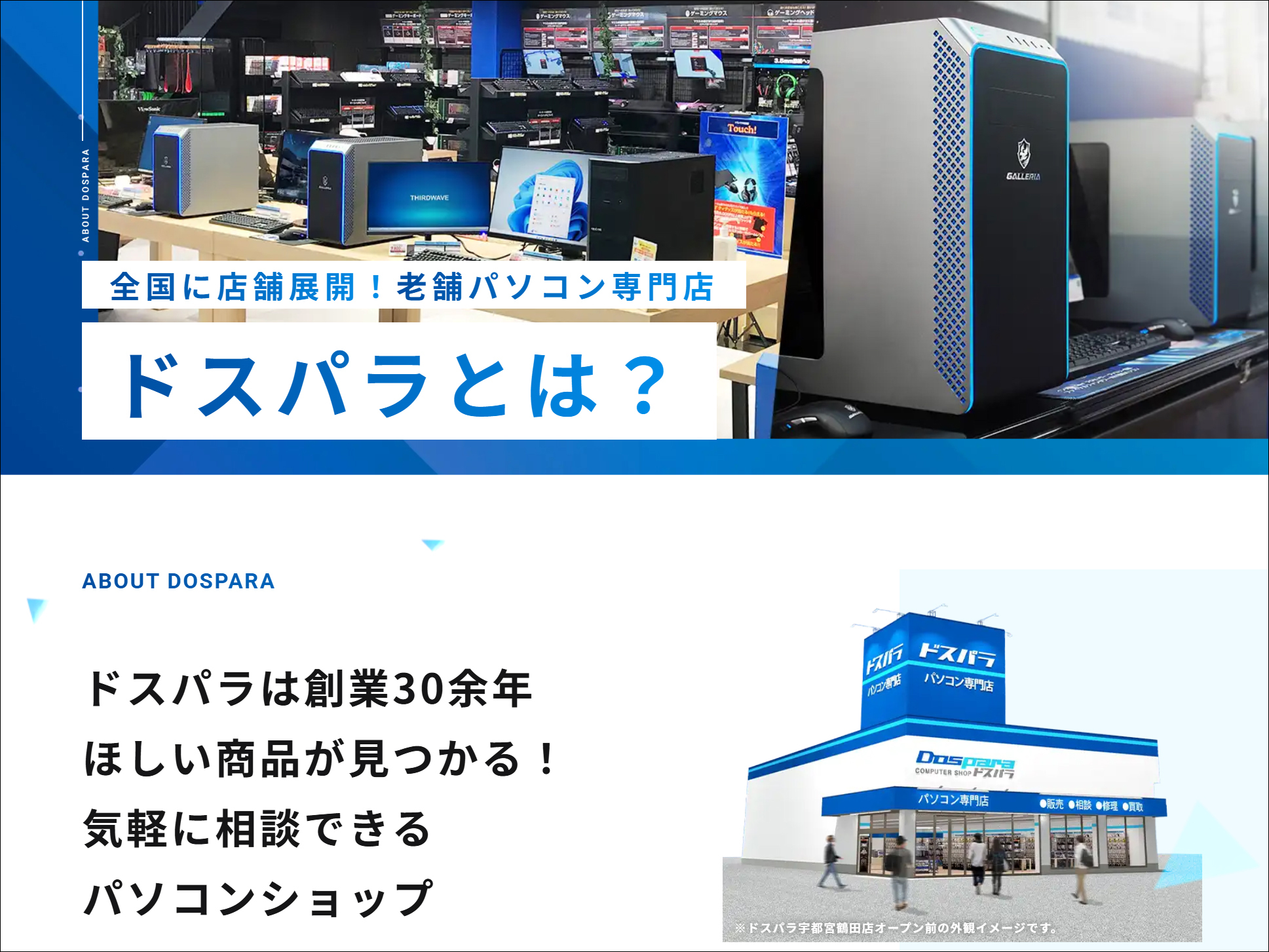 ドスパラでは、自社ブランドのPC、PC自作向けのパーツを、リアル店舗とECサイトで豊富に取り扱っています。リアル店舗では、実機展示や即納モデルの販売はもちろん、PCやPCパーツに関する専門知識を有するスタッフが常駐しているので、パーツ選びや作業で疑問があるときに具体的なアドバイスをもらうことも可能です。ECサイトは、日本国内でも老舗中の老舗。消耗品も含めたPC自作に関する幅広い製品を取り扱っています。