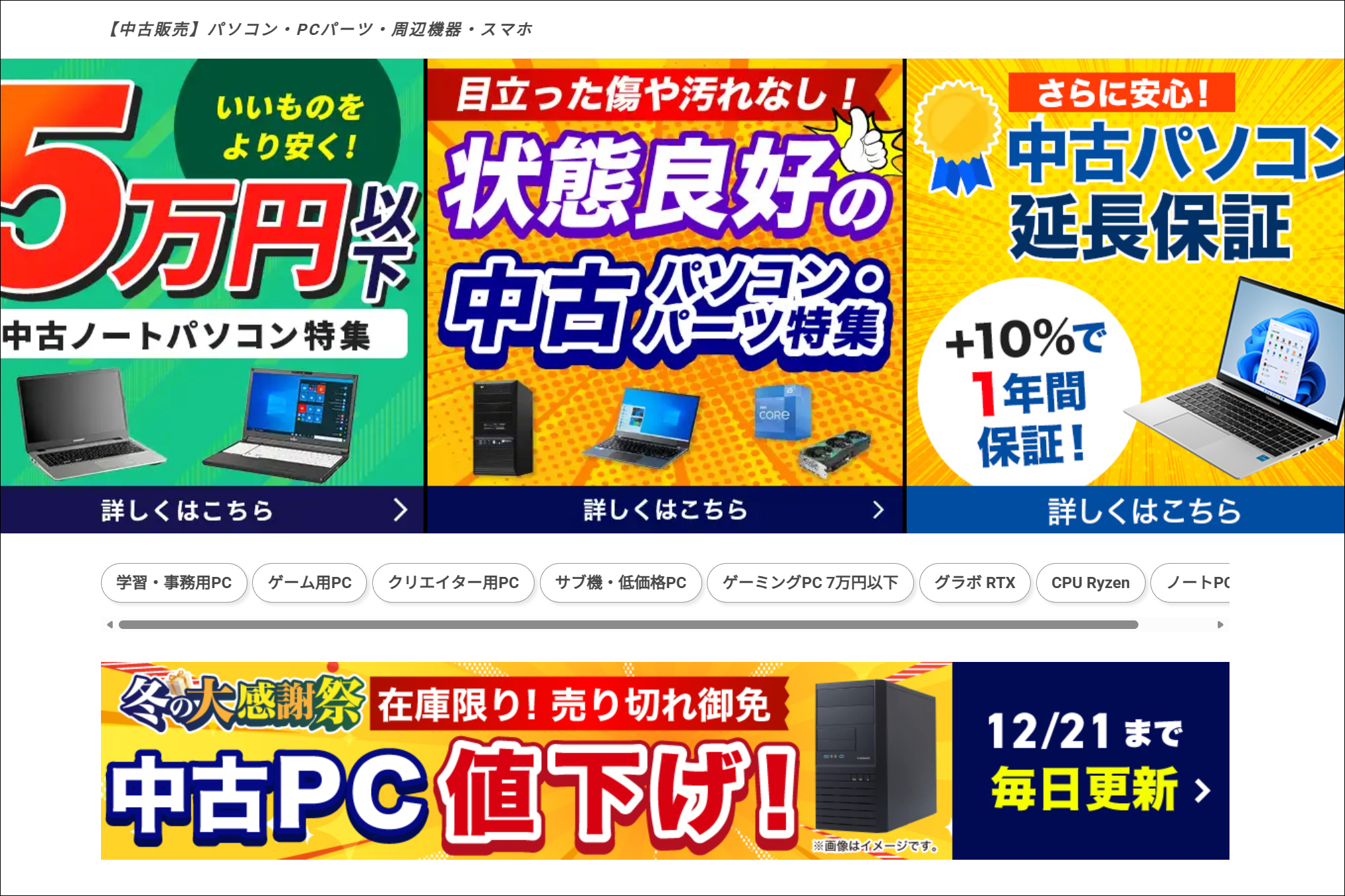 ドスパラは中古販売にも力を入れており、2025年は、店舗の中古販売フロアの拡充、ECサイトでの取り扱い拡大(全国店舗の中古在庫の購入が可能)などの取り組みが行われました。中古の品質に不安を持つ方もいるかもしれませんが、ドスパラが取り扱う中古製品は、動作確認をクリアした万全のクオリティです。購入後の保証制度も用意されているため、その点も安心材料と考えてよいでしょう。