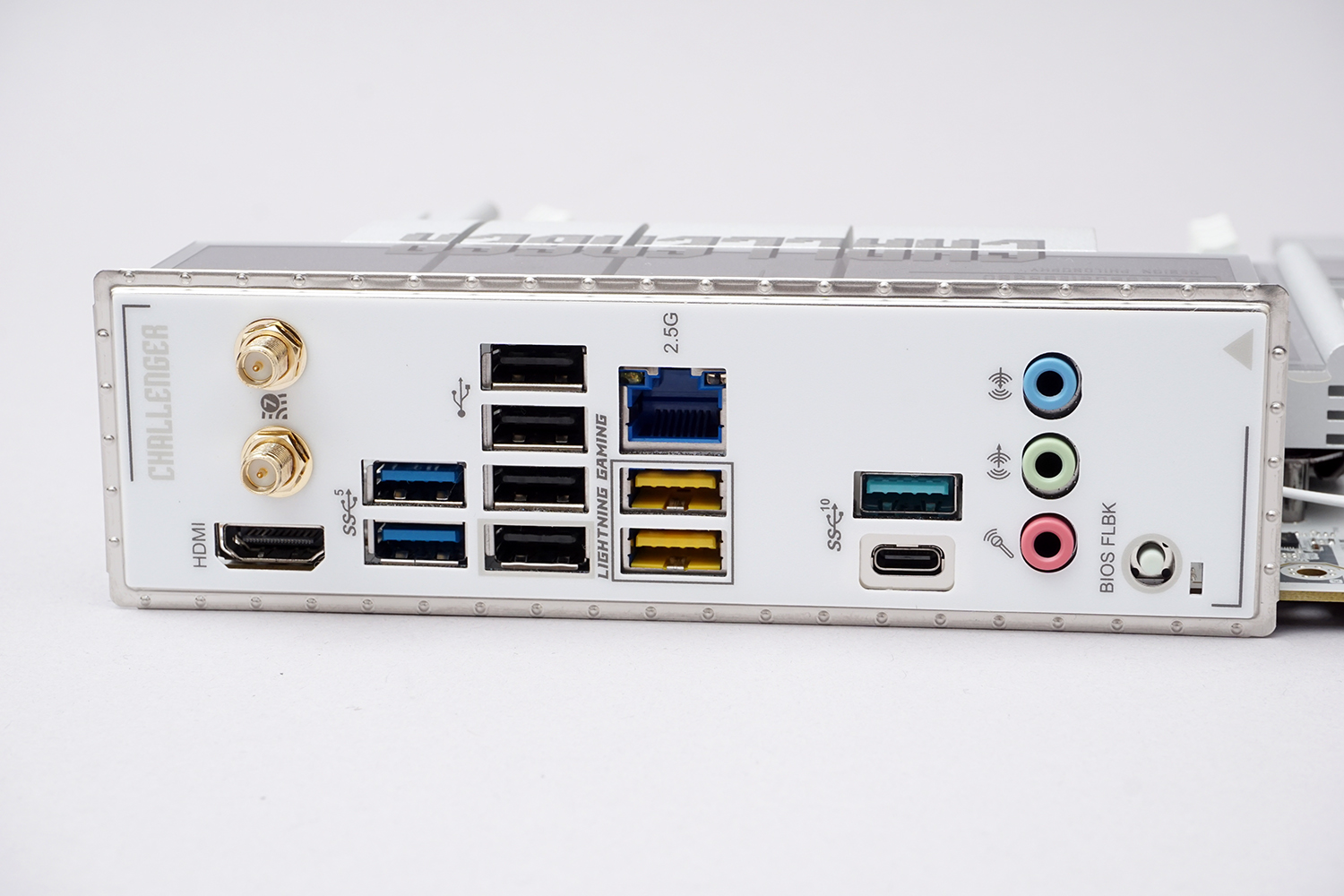 バックパネルのUSBポートのうち、黄色い端子のUSB 5Gbpsポート2基は、ASRock独自の「ライトニングゲーミングポート」に対応。この2つのポートは、それぞれ独立したUSBコントローラーに接続されており、たとえば、ゲーミングマウスとゲーミングキーボードをこのポートに接続した場合、両デバイスのデータ通信はそれぞれ独立した経路でPCとやり取りされる。そのため、特にポーリングレート8,000MHzなどの超高精度&超高速なゲーミングマウス(=その分データ通信量も多くなる)の性能が、ほかのデバイスの通信に巻き込まれて“渋滞する”ことを防ぐことができる、というメリットがある。