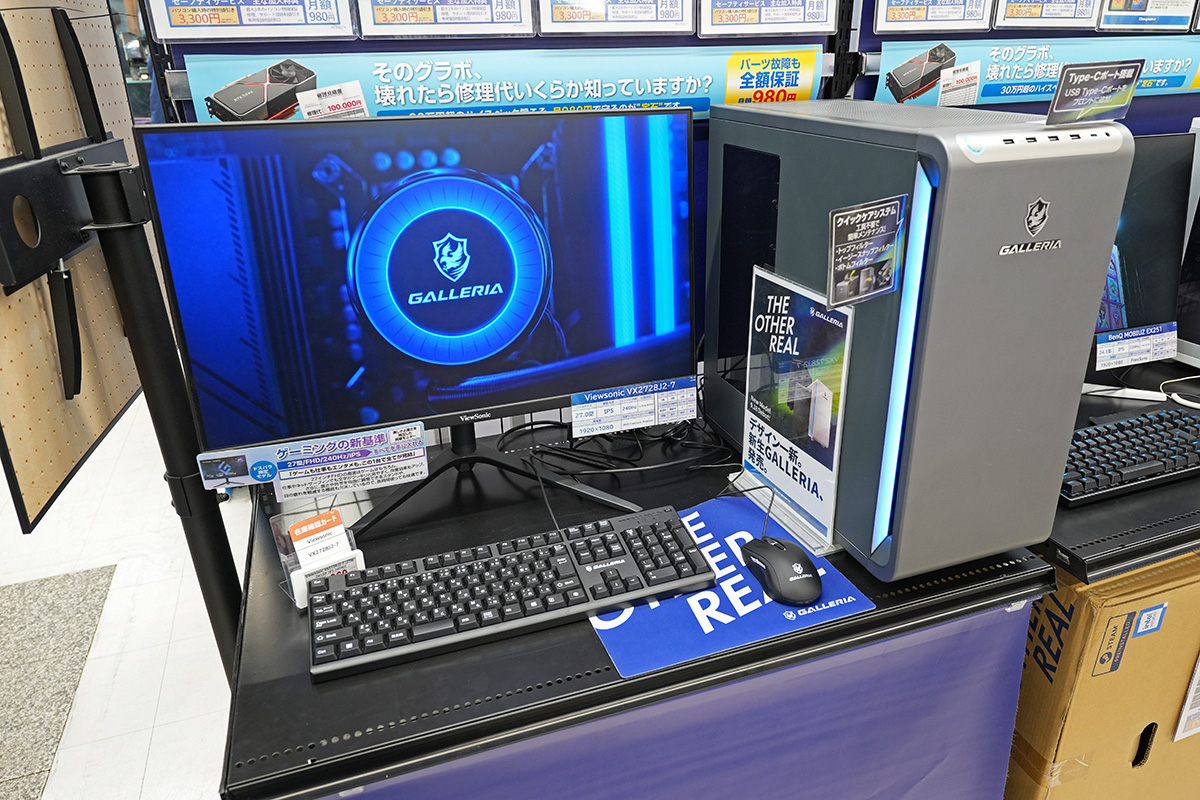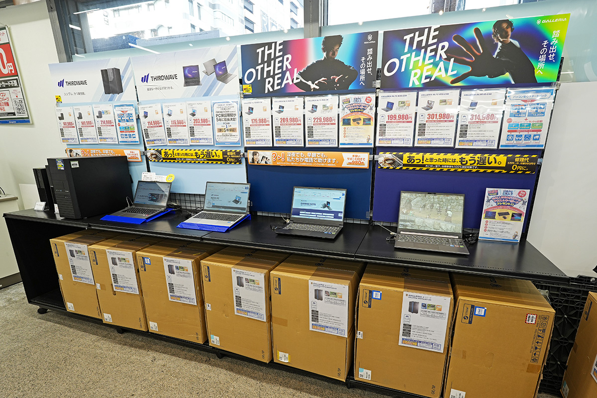 店内に入るとゲーミングやクリエイター向けのハイスペックPCであるGALLERIA や、汎用PCが並べられたエリアが目に入る。華やかなデザインのコラボPCも入口からすぐの目立つ位置に並べられ、硬い雰囲気にならないように意識されている。店舗リニューアルでカジュアルな面を強く打ち出すことで、これまでPC専門店はハードルが高いと思っていた人たちにも気軽に入ってもらえるようになったとのことだ。
