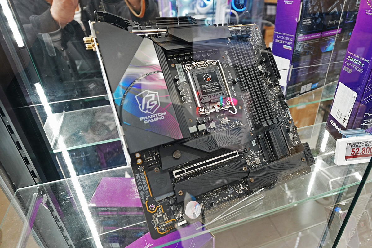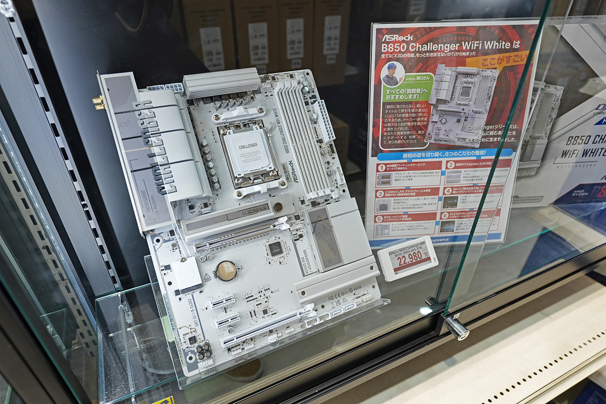 注目モデルや人気モデルはショーケースに実機が展示されており、質感や拡張スロットや端子類の実際のレイアウトを確認できるようにしているという。取材時には製品のポイントなどを紹介したポップと合わせて、複数のマザーボードやビデオカードが展示されていた。